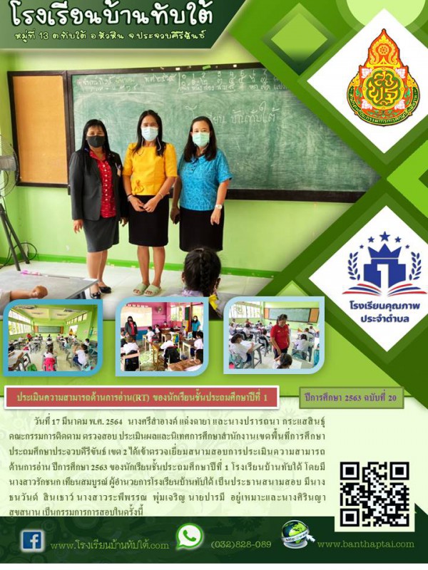 ดำเนินการประเมินความสามารถการอ่านของนักเรียนชั้นประถมศึกษาปีที่ 1 ปีการศึกษา 2563 RT (Reading Test) ณ สนามสอบโรงเรียนบ้านทับใต้