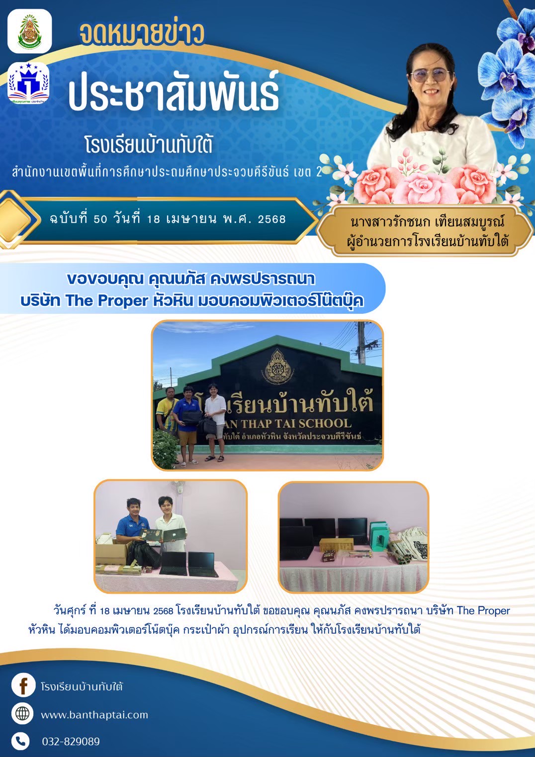 ขอขอบคุณ คุณนภัส คงพรปรารถนา บริษัท The Proper หัวหิน มอบคอมพิวเตอร์โน๊ตบุ๊ค